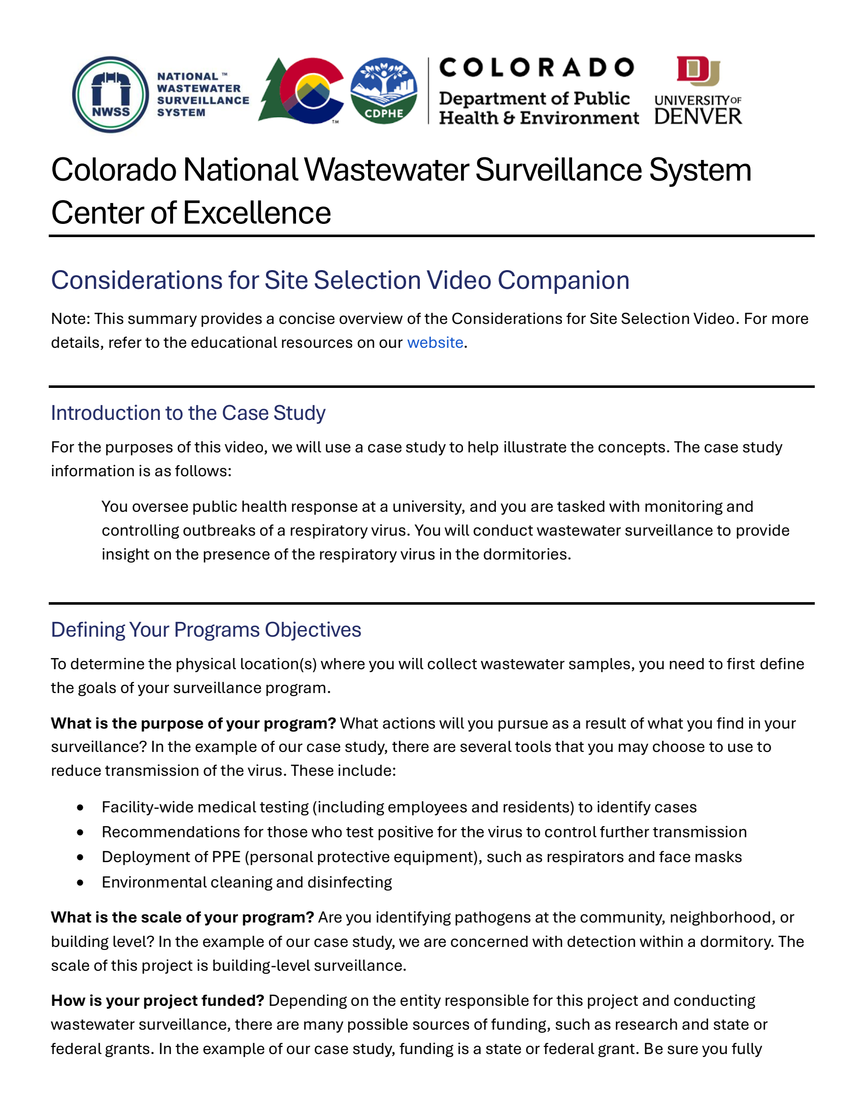 Identified key components: 1) purpose of surveillance, 2) considerations for site selection, 3) three sampling methods, 4) guidance on interpreting results for public health action, and 5) ethics of wastewater surveillance.